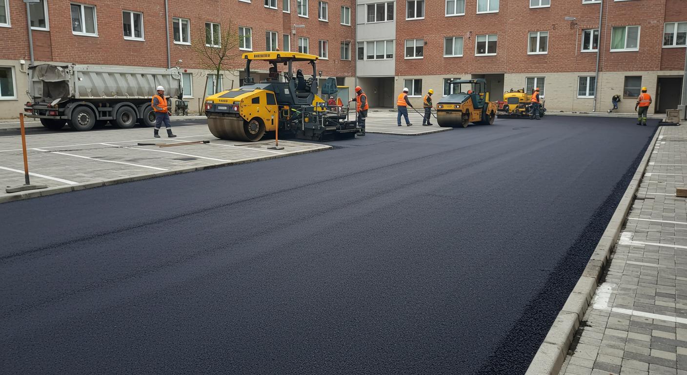 Процесс асфальтирования дворовых территорий с парковкой включает несколько последовательных этапов. На первом этапе проводится подготовка площадки: удаление старого покрытия, выравнивание грунта и создание песчано-гравийной подушки. Этот этап является ключевым, так как от качества основания зависит долговечность всего покрытия. Следующий этап — укладка асфальта с использованием специальной техники, которая обеспечивает плотное сцепление смеси и предотвращает образование трещин и неровностей. После укладки поверхность тщательно уплотняется и оставляется на время для полного схватывания материала.