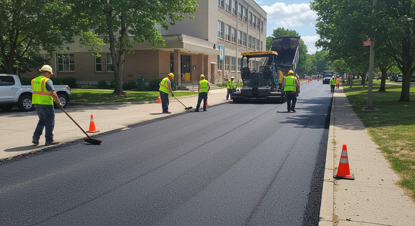 Этапы укладки асфальта около школ и колледжей